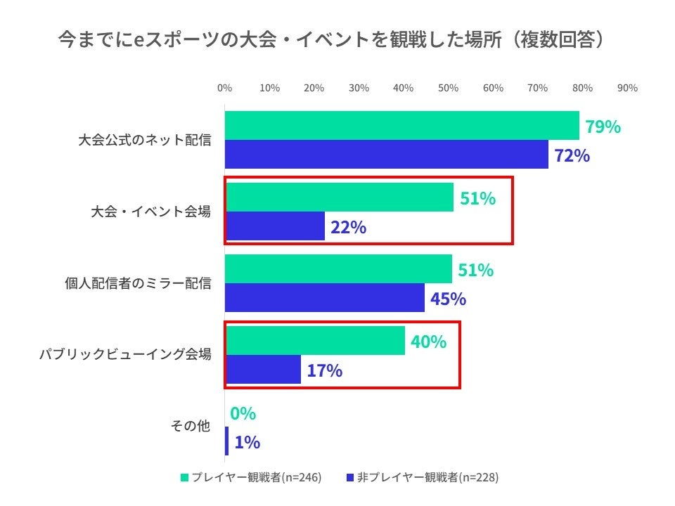 プレイヤー観戦者と非プレイヤー観戦者それぞれに、eスポーツの大会やイベントを観戦したことがある場所を質問したところ、プレイヤー観戦者、非プレイヤー観戦者ともに「大会公式のネット配信」が最も高くなっていました。結果を比較したところ「大会・イベント会場」と「パブリックビューイング会場」で、プレイヤー観戦者が非プレイヤー観戦者に比べて20%以上高くなっていました。