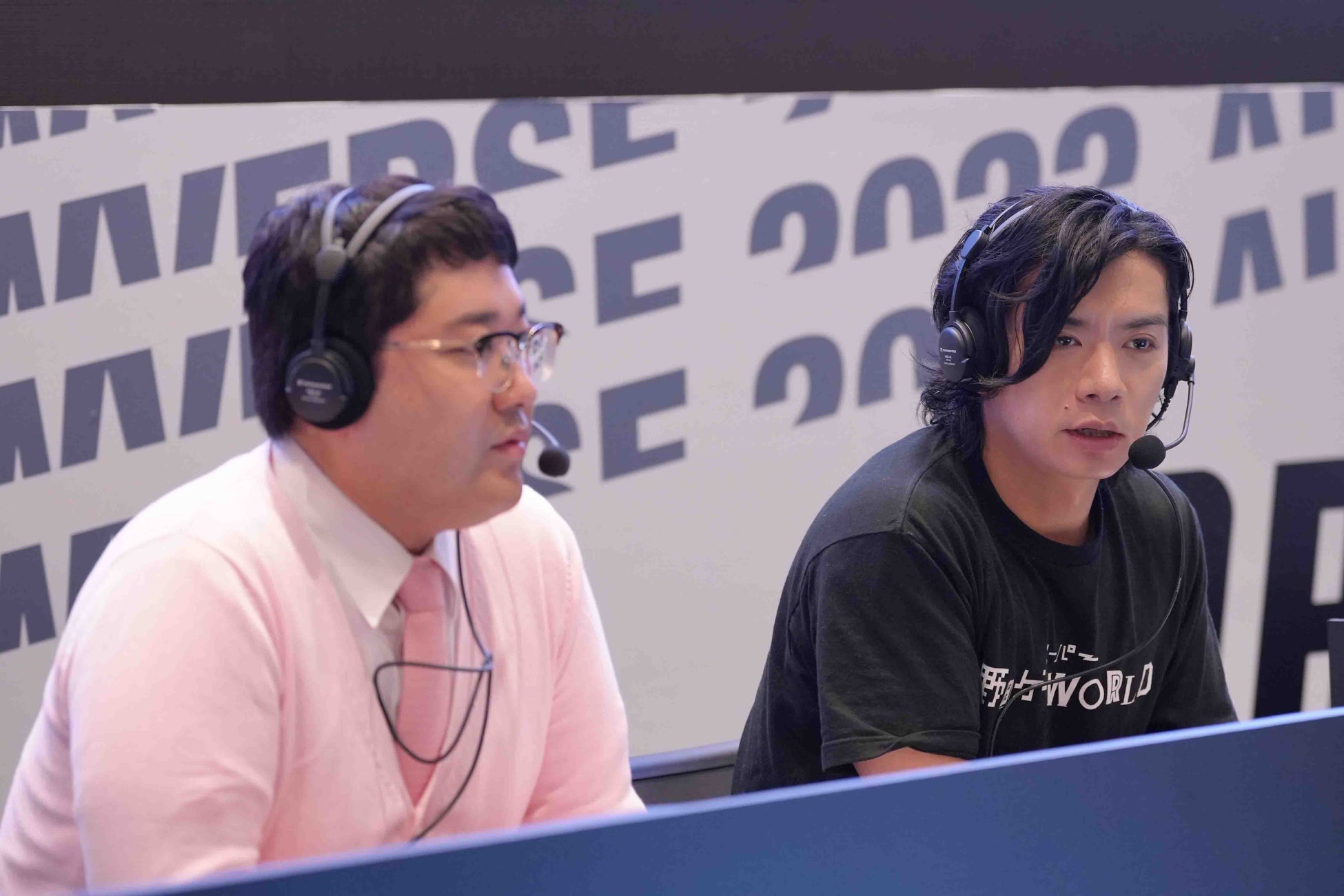 予選大会に続いてオフラインでの開催となったGRAND FINALSの舞台・有明セントラルタワーホールにはファイナリスト8人が集結。会場では司会と進行を務めたテレビ朝日アナウンサーの布施宏倖さんとコスプレイヤーでありYouTuber・ゲーム実況者でもあるみゃこさん、実況の友田一貴さん・平岩康佑さん、解説のまるさん・海老原悠さんといった面々が大会の行方を見守りました。