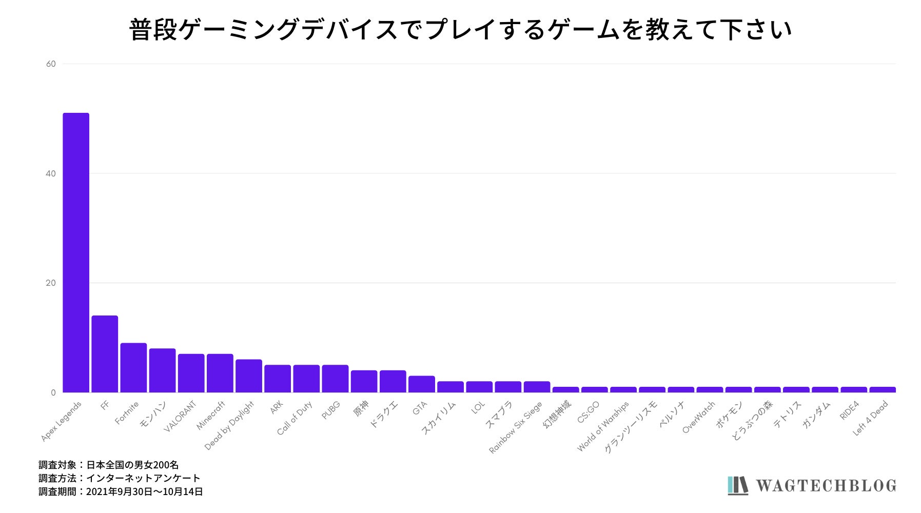 また今回調査を行ったゲームプレイヤーが普段プレイするゲームは「Apex Legends」や「ファイナルファンタジー」や「Fortnite」が人気でした。