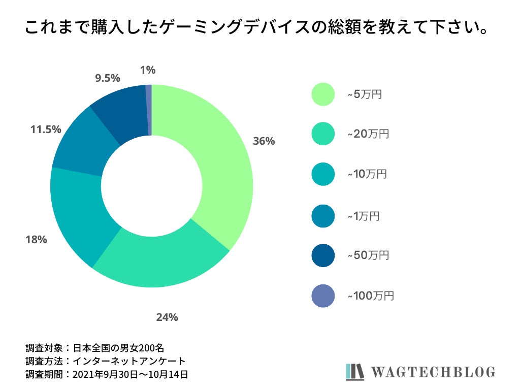 「これまで購入したゲーミングデバイスの総額」の調査では、5万円以下が最も多く、その次に10万円~20万円が多いことが判明しました。