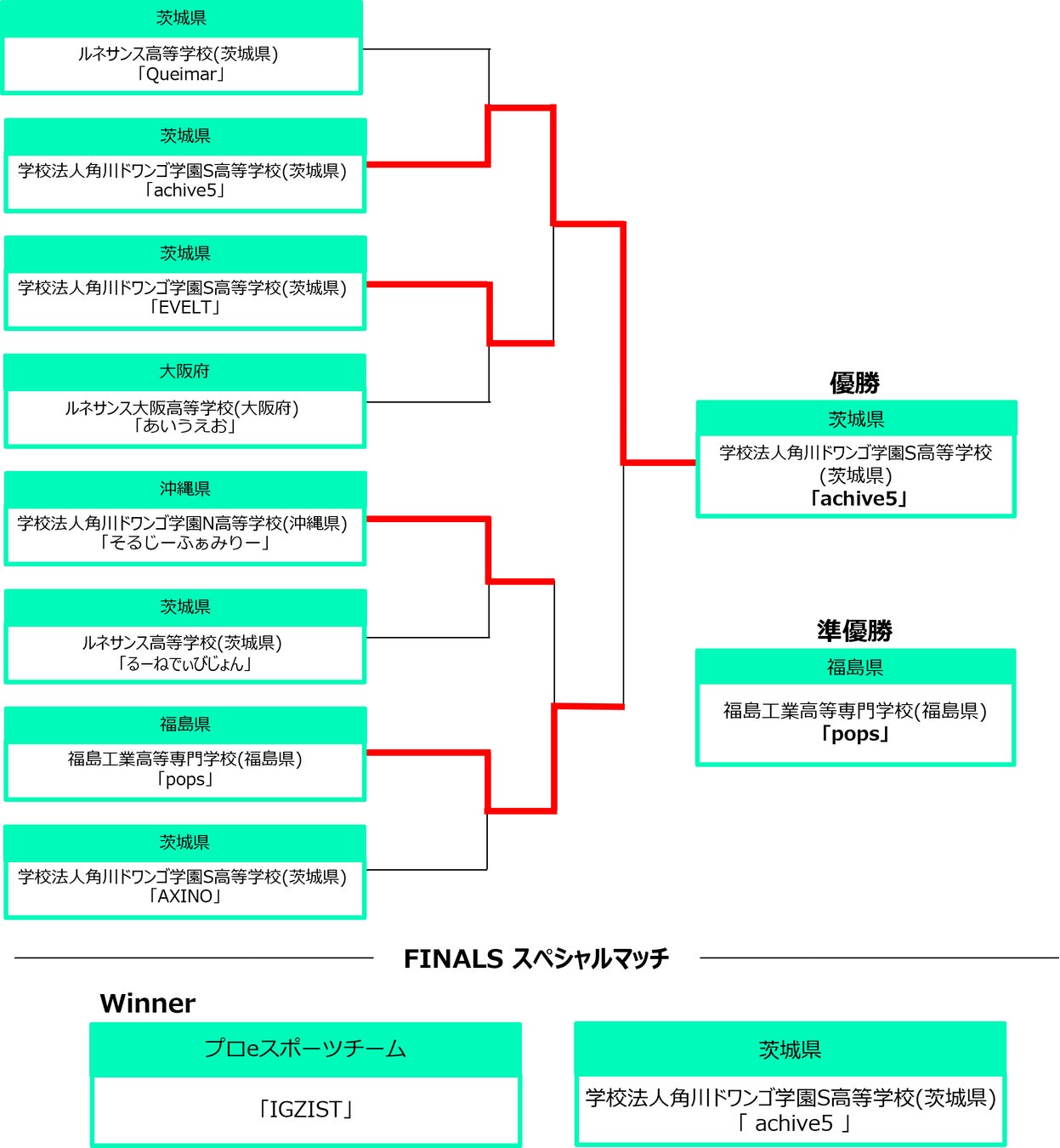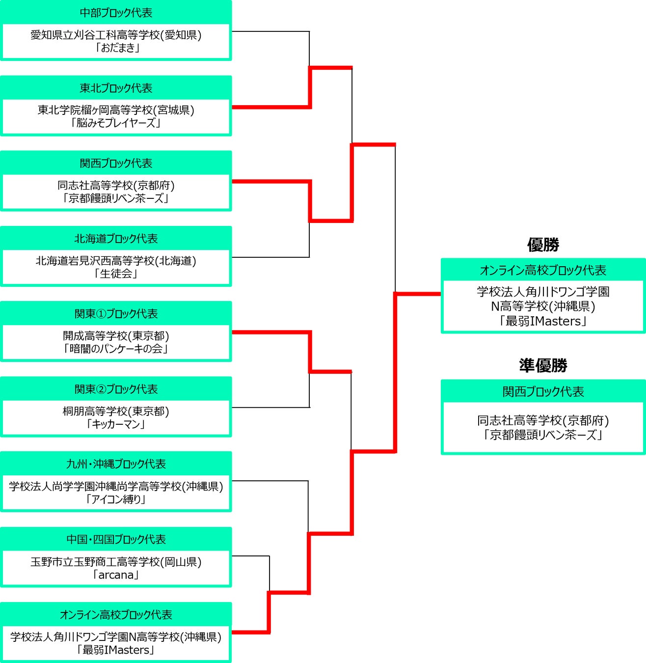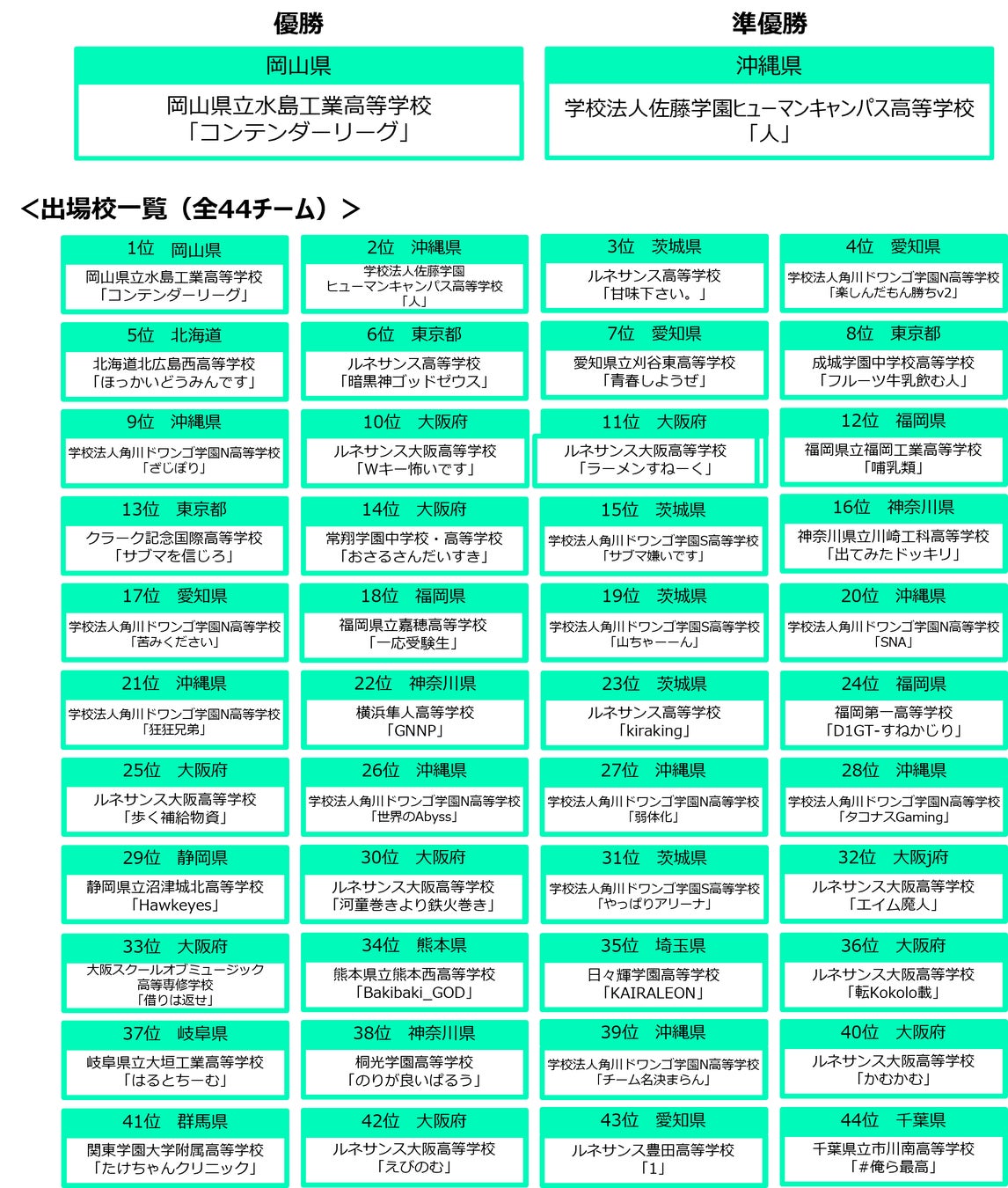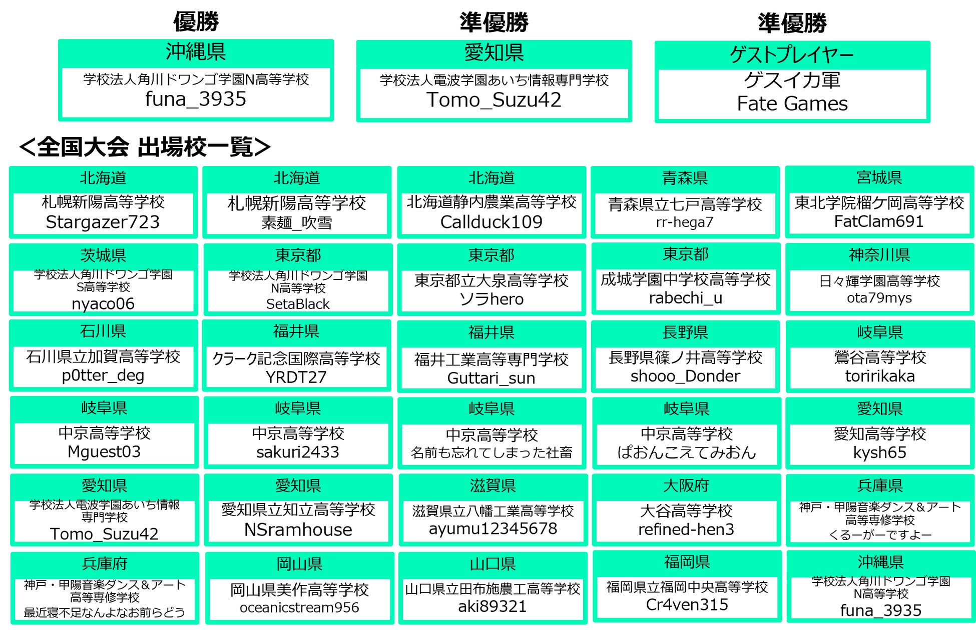 リーグ・オブ・レジェンド部門では、学校法人角川ドワンゴ学園N高等学校(沖縄県)「N1」、クラッシュ・ロワイヤル部門では、 学校法人角川ドワンゴ学園N高等学校(沖縄県)「最弱IMasters」、フォートナイト部門では、岡山県立水島工業高等学校(岡山県)「コンテンダーリーグ」が、GAME PARTY フォールガイズ部門では学校法人角川ドワンゴ学園N高等学校(沖縄県)「funa_3935」、ヴァロラント部門では学校法人角川ドワンゴ学園S高等学校(茨城県) 「achive5」が、栄えある日本一高校生チームに輝きました。