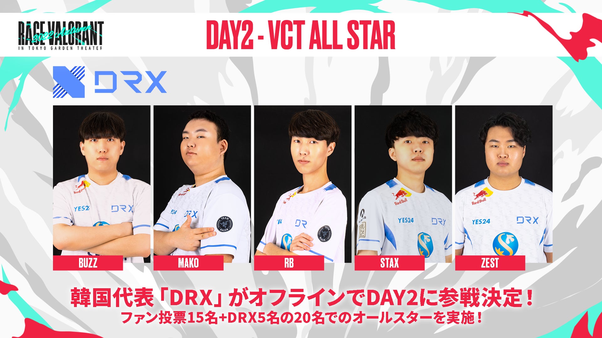 DAY2となる10月9日(日)の出場チームは「2022 VALORANT Champions Tour Stage2 Playoffs」に進出した日本を代表する8チームからファン投票で15名が選出され、特別ゲストとなる韓国のDRXの5名も参加し、20名をミックスし日韓のオールスターエキシビションを実施します。