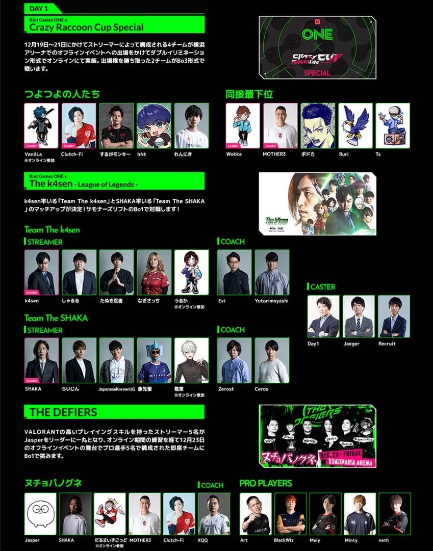 株式会社CyberZ、エイベックス・エンタテインメント株式会社、株式会社テレビ朝⽇が運営する国内最⼤級のeスポーツエンターテインメント「RAGE(レイジ)」は、合同会社ライアットゲームズによるオンラインとオフラインの複合イベント「Riot Games ONE」の一部オンラインイベントおよびオフラインイベントの制作・運営を担います。