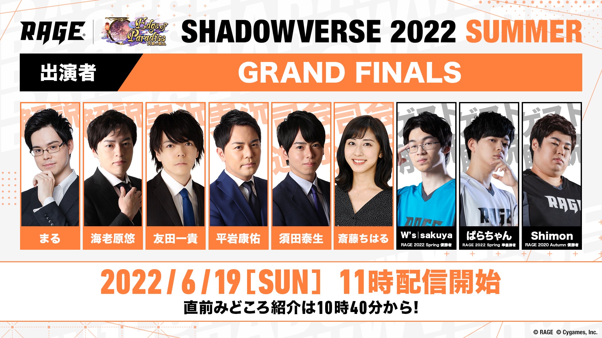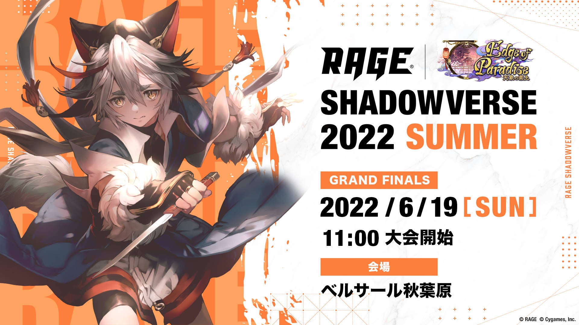 株式会社CyberZ、エイベックス・エンタテインメント株式会社、株式会社テレビ朝⽇が運営する国内最⼤級のeスポーツエンターテインメント「RAGE(レイジ)」は、対戦型オンラインTCG『Shadowverse』の大会「RAGE Shadowverse 2022 Summer」の決勝トーナメントにあたるGRAND FINALSを2022年6月19日(日)にベルサール秋葉原にて開催します。