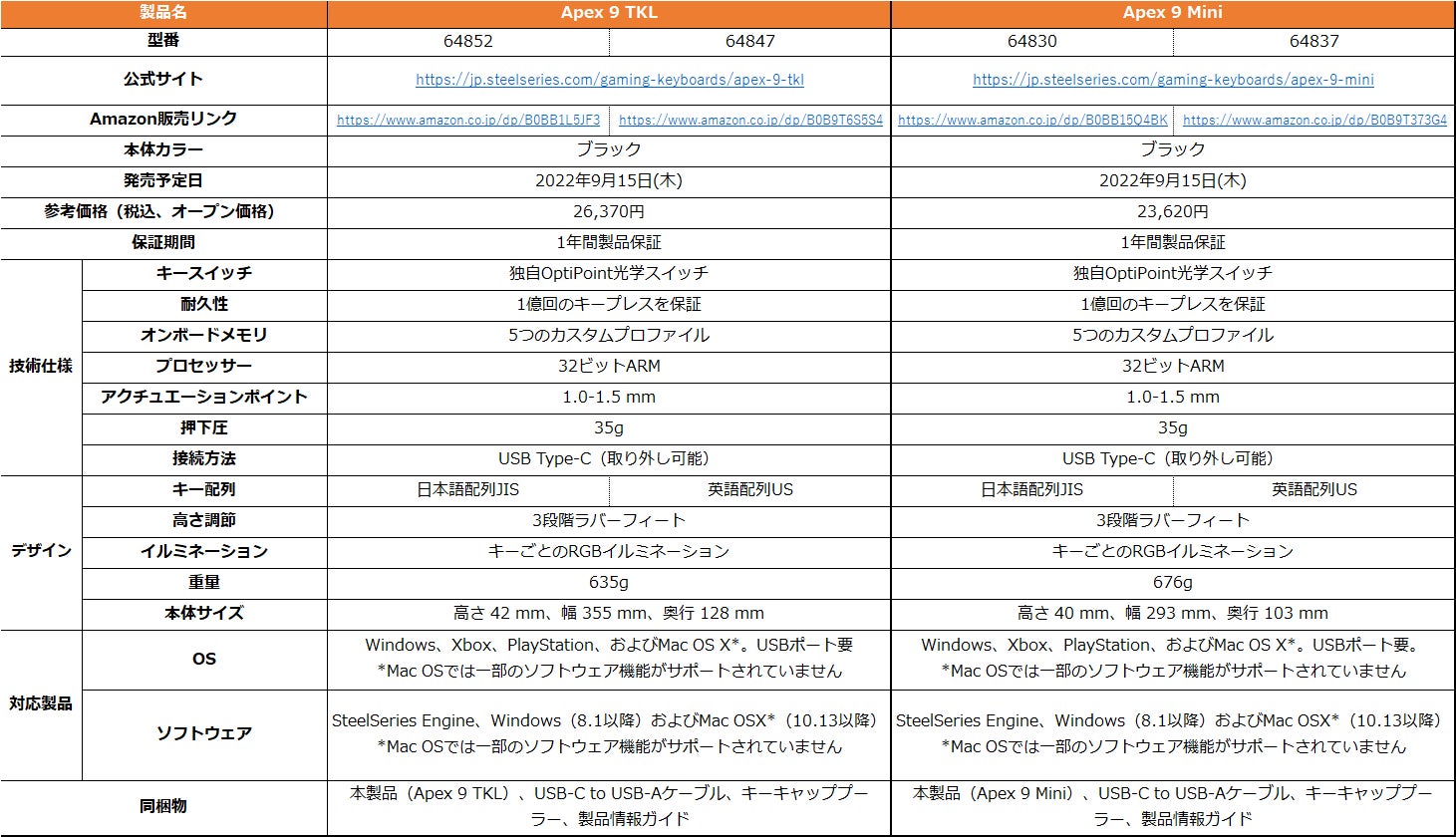 スティールシリーズジャパン株式会社(本社:東京都千代田区 、カントリーマネージャー:石井 靖人)は、「Apex 9 Mini」「Apex 9 TKL」を発表しました。