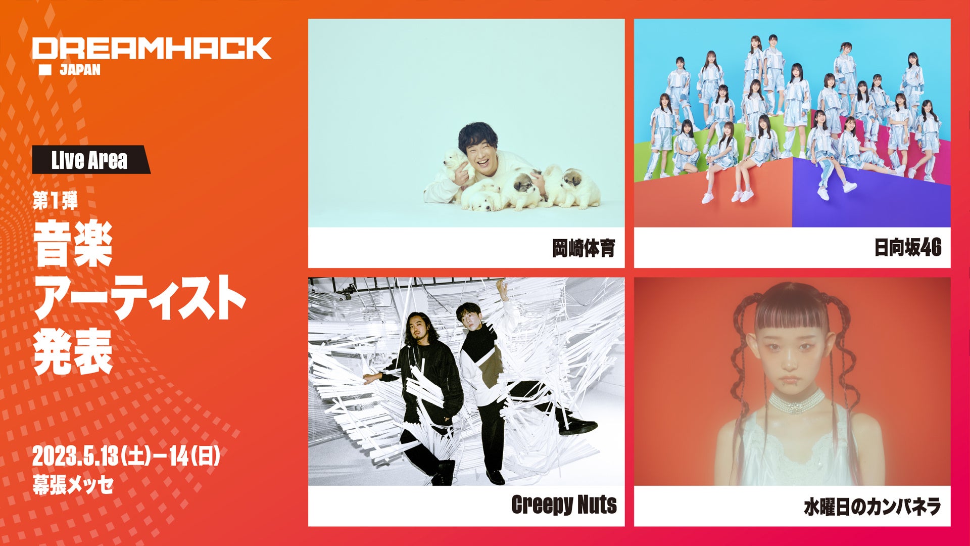 <Live Area>では、2日間に渡って多数のアーティストが登場し、圧倒的なクオリティのステージライブでDreamHackの音楽体験をお届けします。第1弾発表となるアーティストとして岡崎体育、Creepy Nuts、水曜日のカンパネラ、日向坂46が名を連ね、ゲームと音楽によるエンタテインメント体験をさらに盛り上げます。