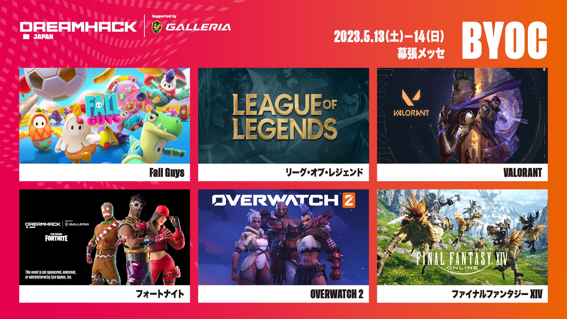 BYOCでは、「リーグ・オブ・レジェンド」「VALORANT」「フォートナイト」「OVERWATCH 2」「ファイナルファンタジーXIV」「FALL GUYS」の6つの大人気タイトルにおいて、DreamHack Japanの主催による大会開催を予定しています。