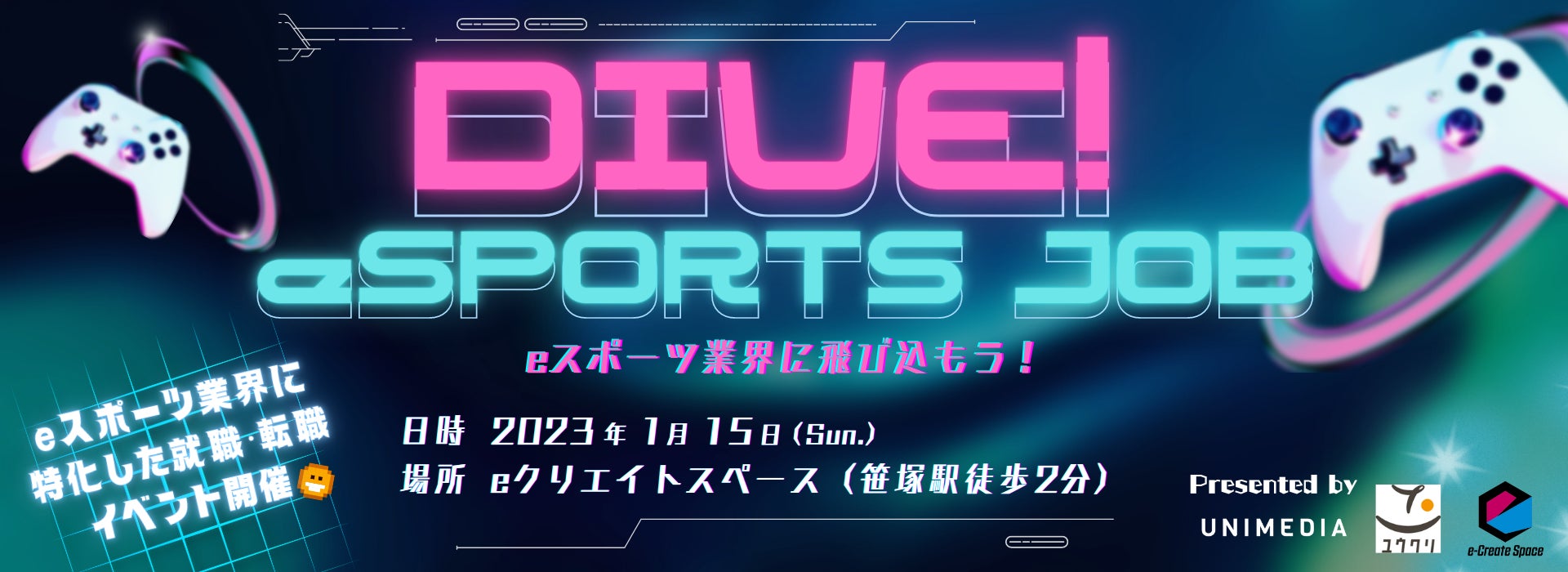株式会社ユニメディア(本社:東京都千代田区、代表取締役社長:末田 真、以下「当社」)と、eスポーツ特化型スタジオの運営とデザイナー・クリエイター専門の人材サービスを展開する「株式会社ユウクリ」(本社:東京都渋谷区、代表取締役:武藤覚)は、eスポーツ業界の就職に特化した就職フェア「DIVE! eSPORTS JOB- eスポーツ業界に飛び込もう! -」を、2023年1月15日(日)13時に開催することをお知らせいたします。