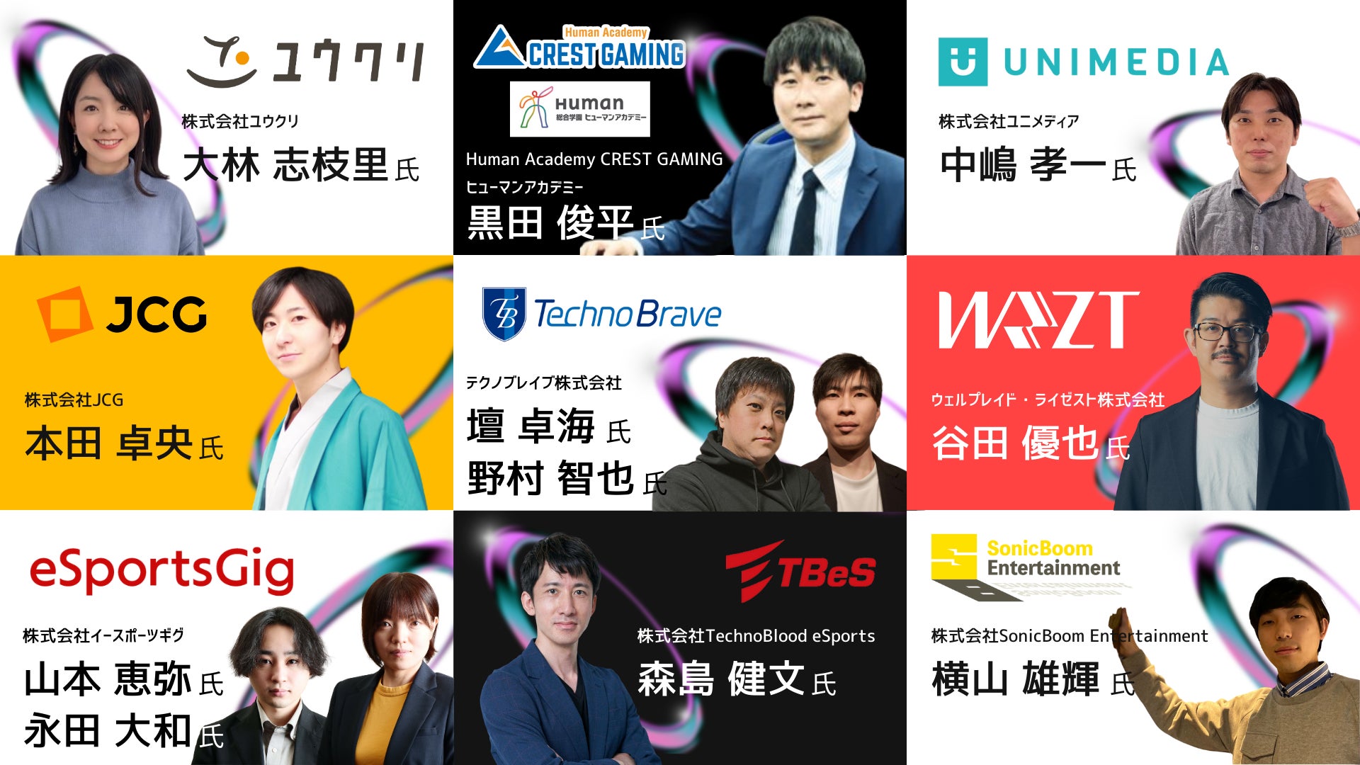 | 登壇企業 | Human Academy CREST GAMING / ヒューマンアカデミー ウェルプレイド・ライゼスト株式会社 テクノブレイブ株式会社 株式会社JCG 株式会社SonicBoom Entertainment 株式会社TechnoBlood eSports 株式会社イースポーツギグ 株式会社ユウクリ 株式会社ユニメディア (五十音順) |