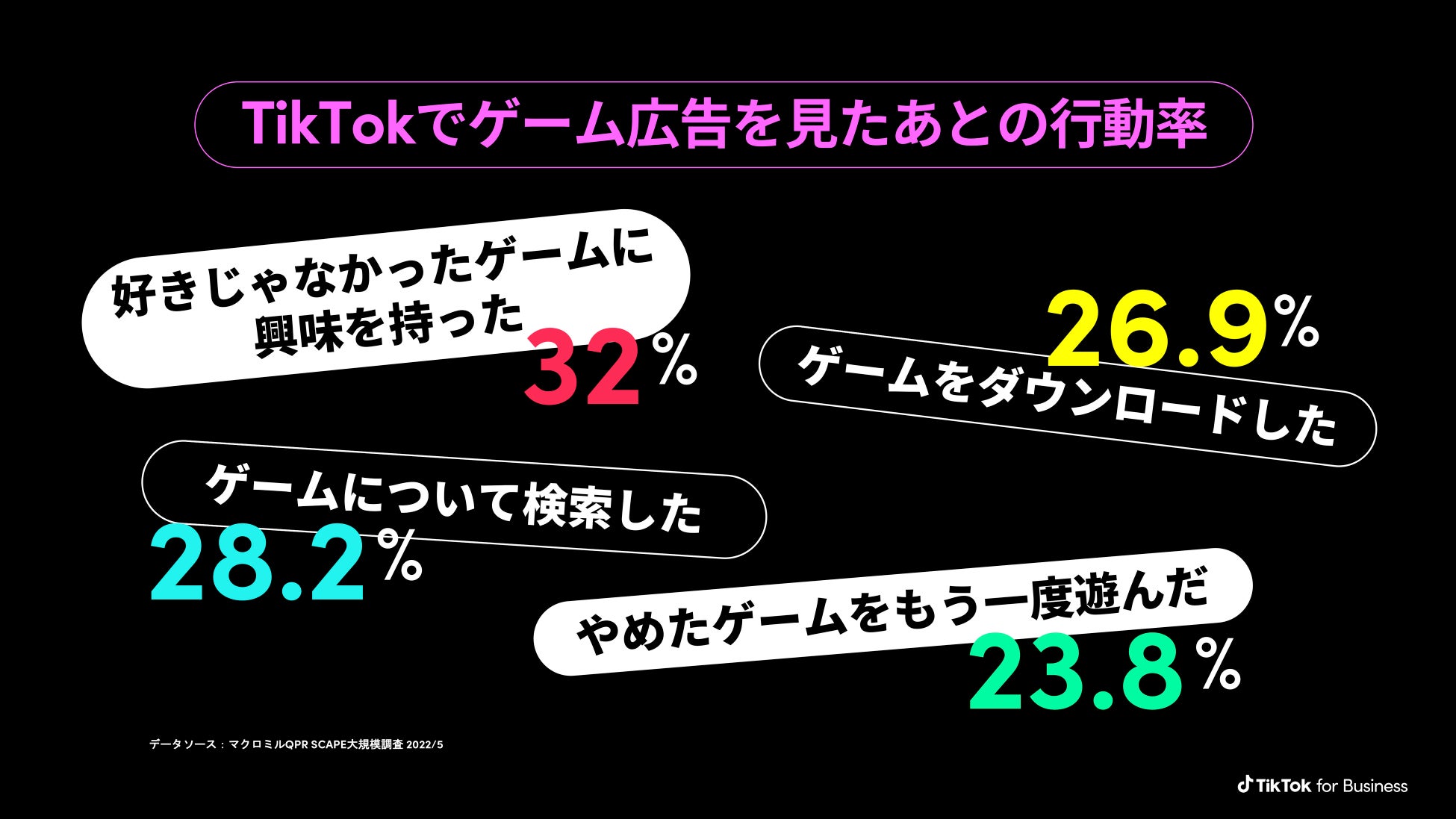 さらに、TikTokでゲーム広告を見たあとの行動に関する調査データも紹介しました。