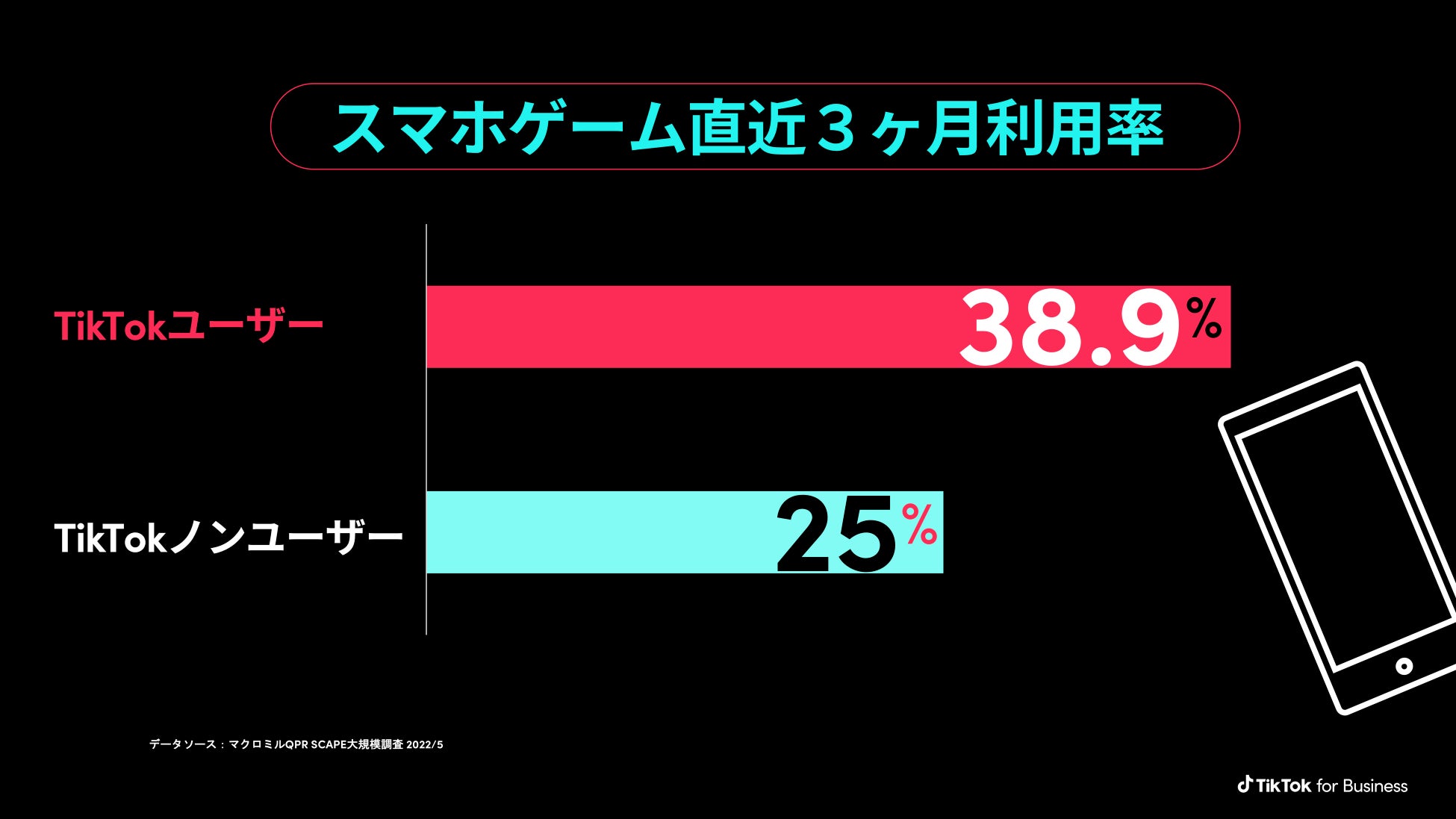 また、TikTokの中でもゲームジャンルに特化した調査データを用意し、TikTokユーザーとTikTokノンユーザーとのスマホゲーム、コンソールゲームの利用実態の違いについても解説しました。