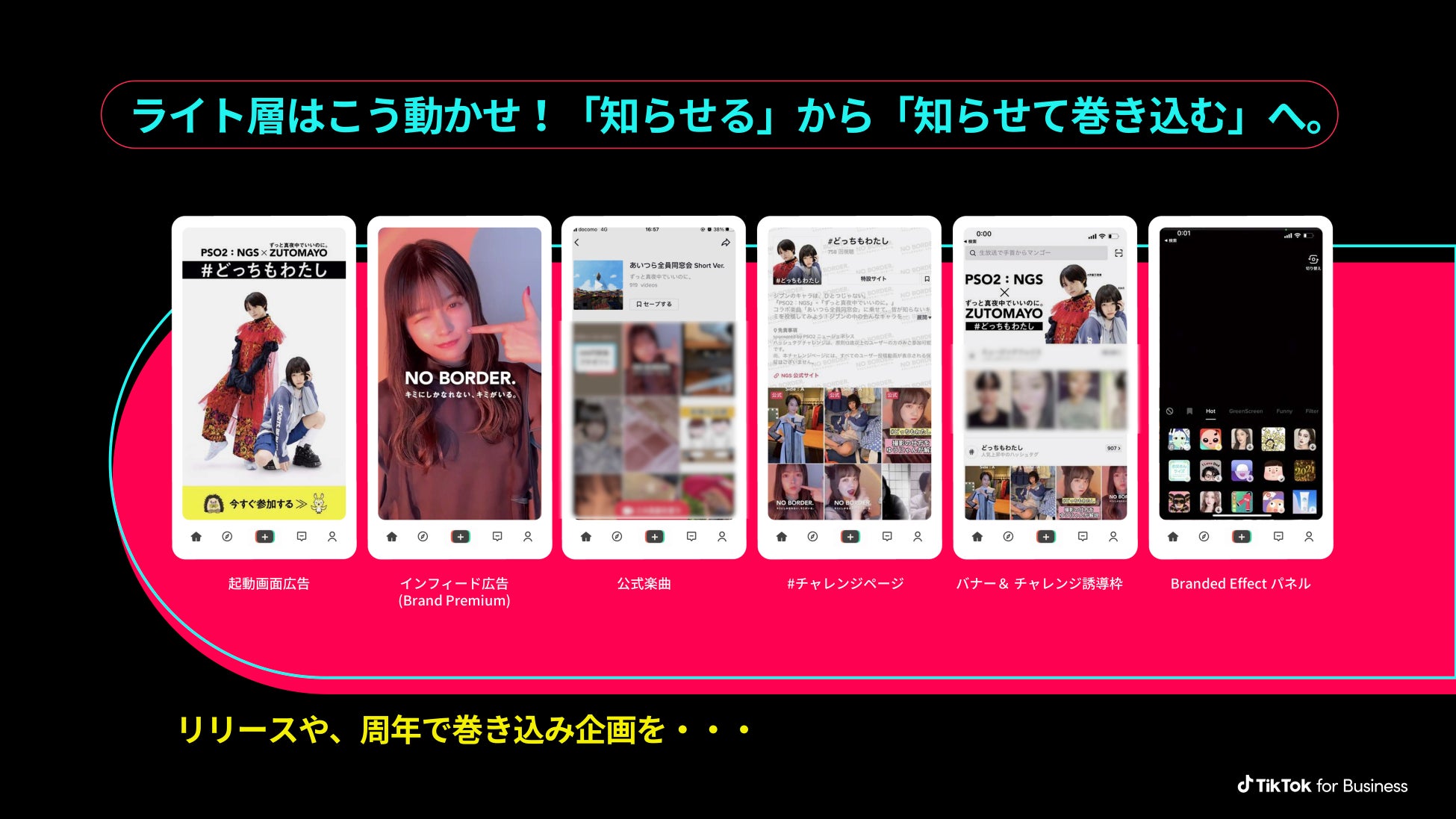 また、広告媒体としてのTikTok活用において効果を最大化する方法についても、昨年実施したPSO2ニュージェネシスのハッシュタグチャレンジ「#どっちもわたし」を事例に詳しく解説しました。
