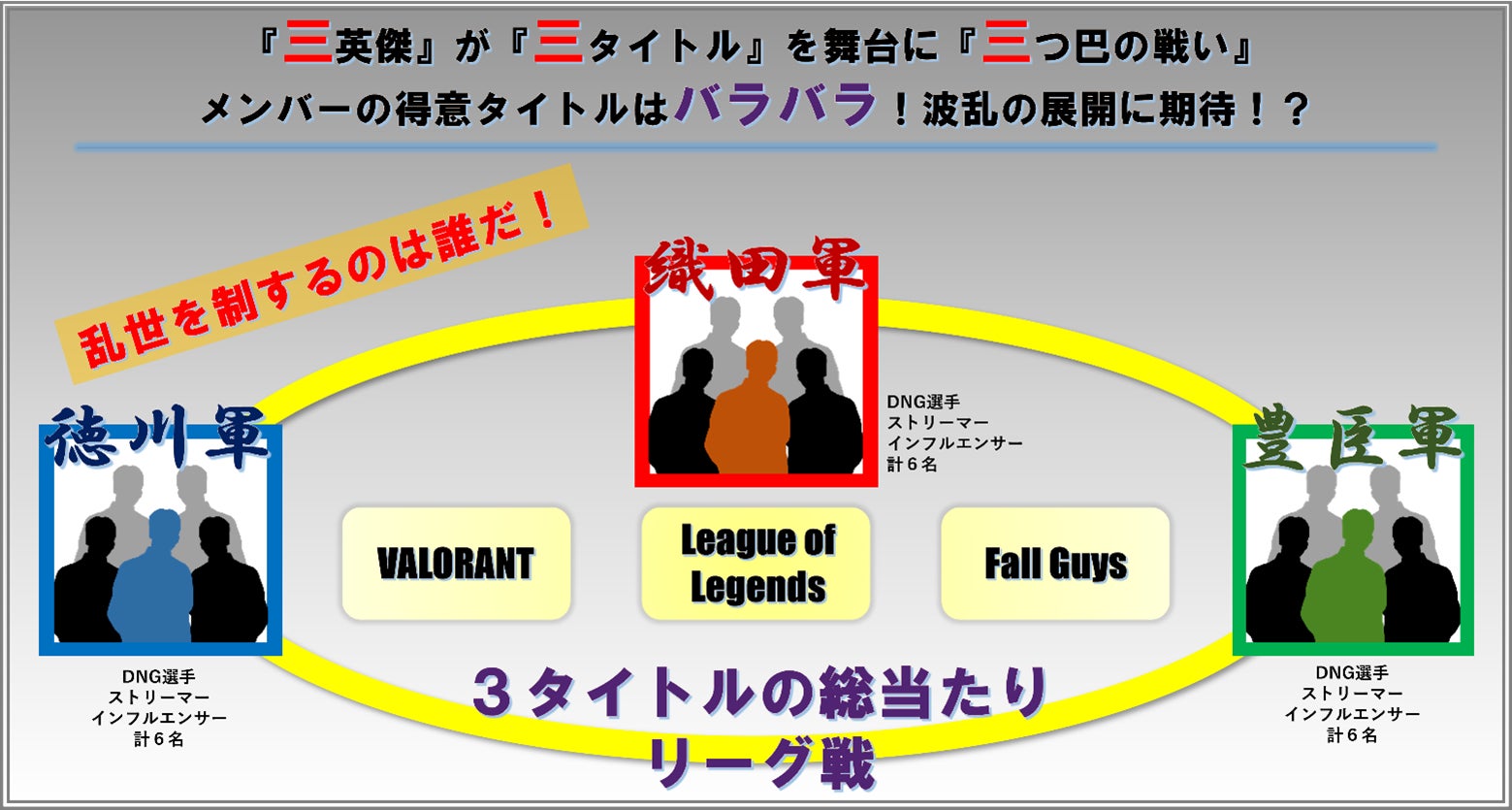 本イベントでは、DetonatioN Gaming 所属プロ選手が3つのチームのリーダー「三英傑」となり、VALORANTやLeague of Legends、Fall Guysといった人気の3つのゲームタイトルを舞台に対戦するリーグ戦を行います。