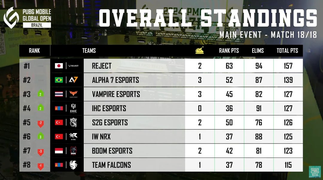 REJECTは本大会にPUBG MOBILE JAPAN LEAGUE SEASON3 Phase2 優勝チームとして参加。Day1を5位で締めくくり上々のスタートを切りました。Day2では、首位であった地元ブラジルの強豪チーム「Alpha7 Esports」との30ポイント以上の差を追い抜き、暫定1位で最終日へ。最終日であるDay3では初戦で獲得数0ポイントに終わり2位「Alpha7 Esports」とのポイント差わずか3ポイントに。しかし、そこからREJECTが意地をみせ2試合目終了時には2位「Alpha7 Esports」との差を11ポイントと引き離しました。そこから流れを掴んだREJECTは各試合で上位を獲得し続け、最終157ポイントを獲得し、見事世界一に輝きました。