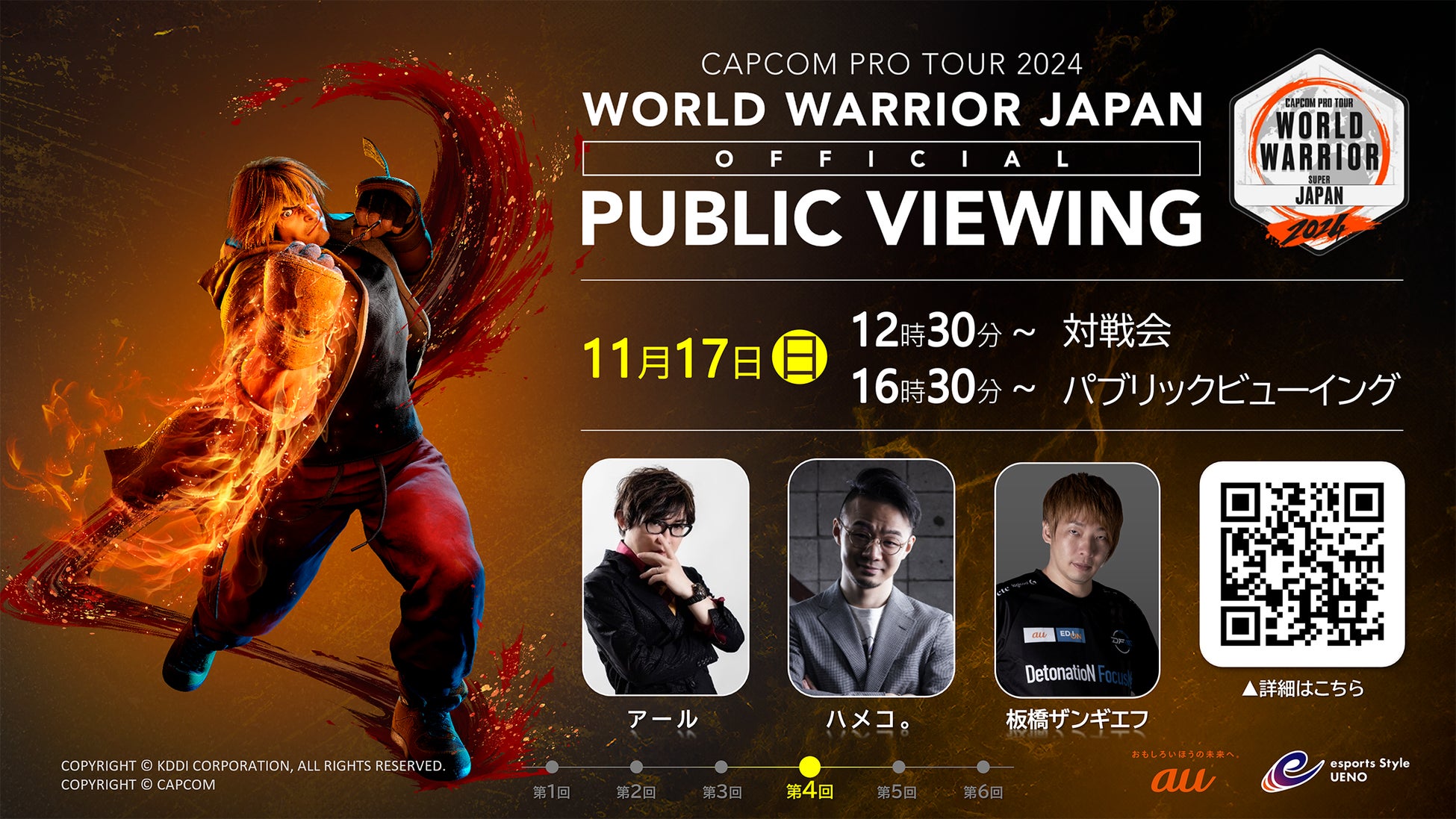 チケット詳細ならびに購入方法・販売期間などは、「CAPCOM Pro Tour 2024 ワールドウォリアー 日本大会 オフィシャルパブリックビューイング」特設サイト(https://esports.au.com/worldwarrior2024/ )もしくはesports Style UENO公式X(@au_esports_UENO)をご確認ください。