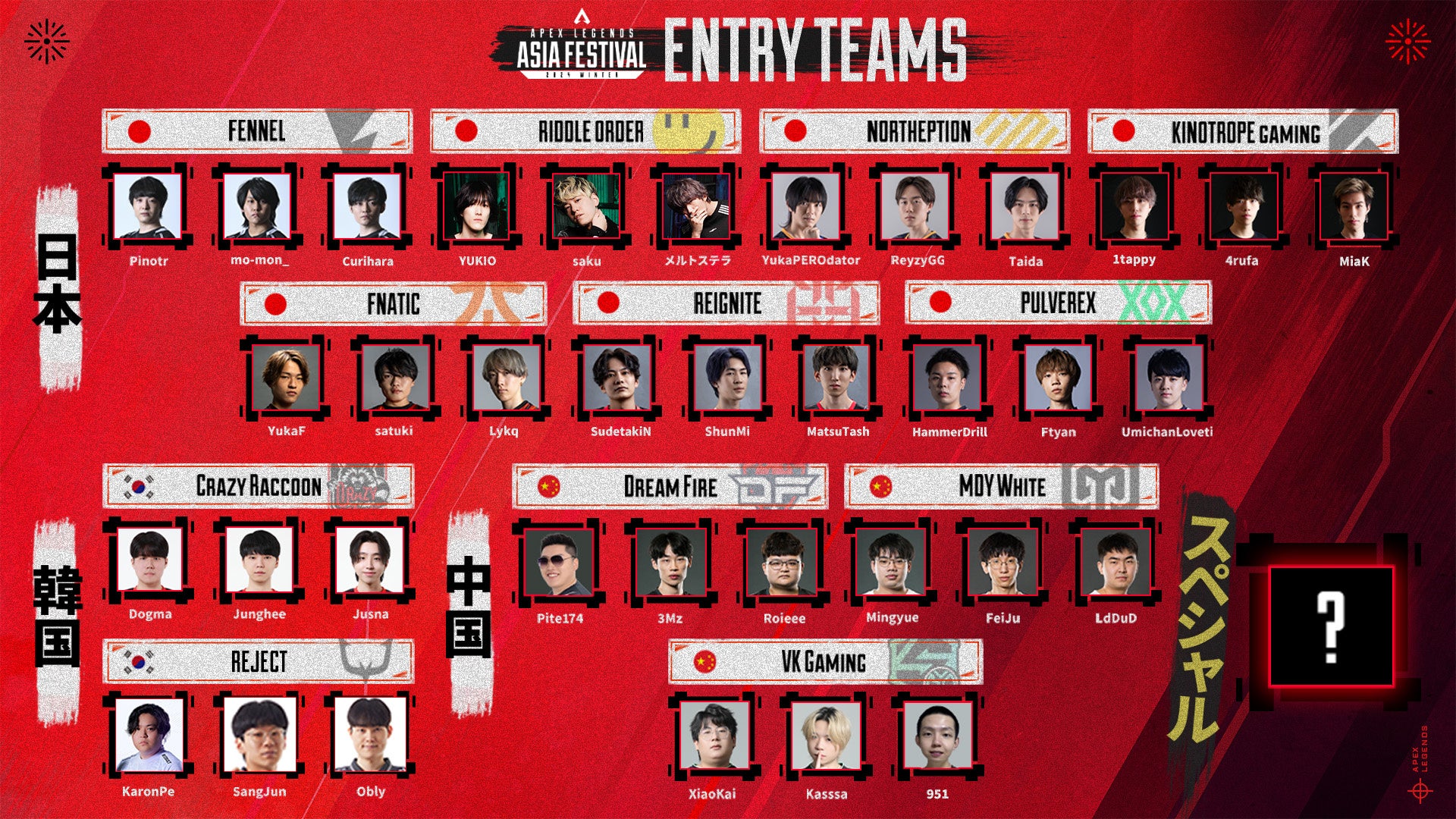 日本:FENNEL/FNATIC/PULVEREX/RIDDLE ORDER/REIGNITE/KINOTROPE gaming/NORTHEPTION(他2チームはPlayalive、ESCLで決定)