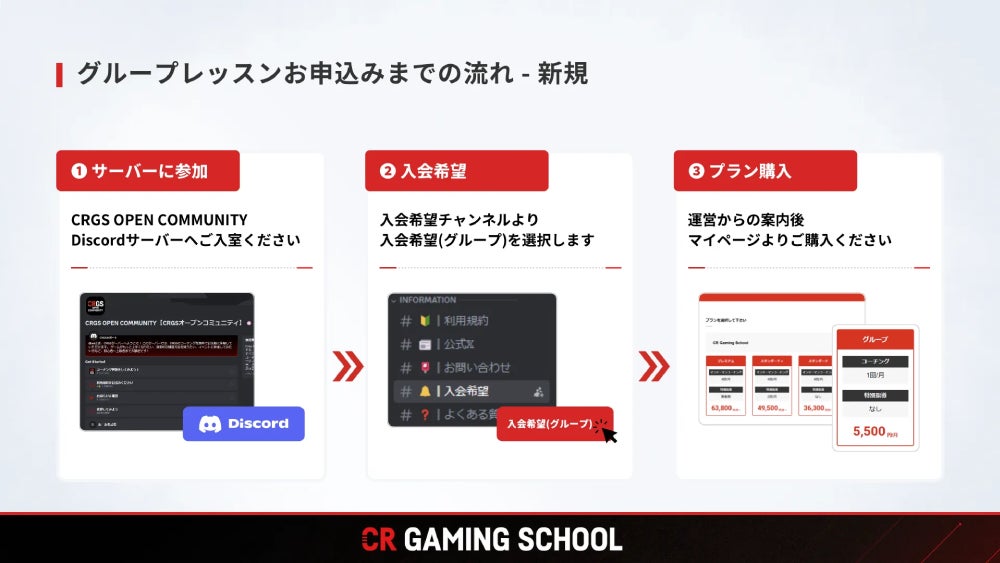 グループレッスンの受講を希望する方は、CRGS Discordサーバー「CRGS OPEN COMMUNITY」に入室し、INFORMATIONの入会希望チャンネルで[入会希望(グループ)]を選択してください。運営スタッフからDiscord ID宛に入会案内を送付します。