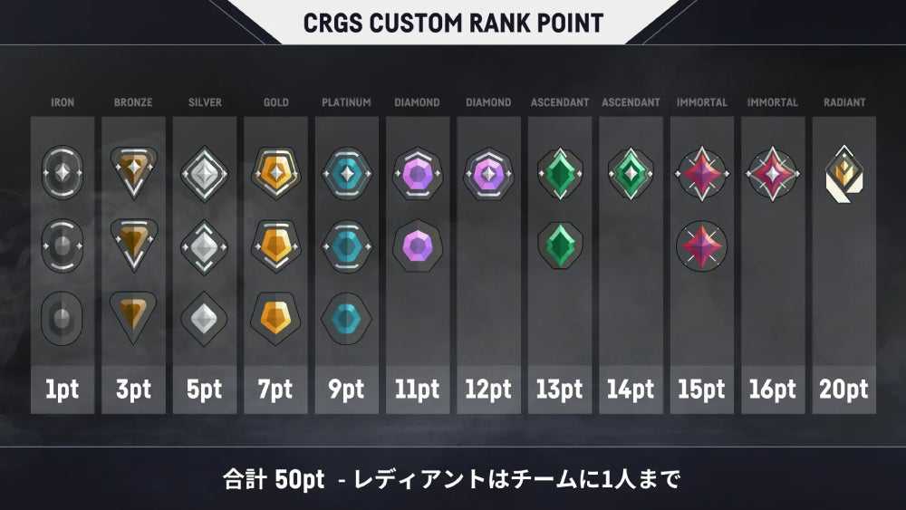 各ランクにポイントを割り振っています。チームメンバーのランクポイントの合計が50ポイント以内に収まるように編成してください。