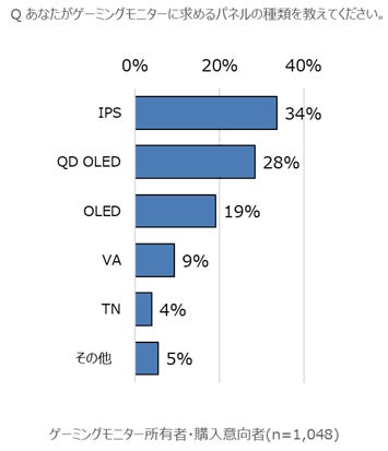 ゲーミングモニターに求める画面サイズを尋ねたところ、23~25インチが高く36%、つづいて27インチが27%という結果に。ゲーミングモニターに求めるパネルの種類は、IPSが34%で最も高く、つづいてQD OLEDが28%。
