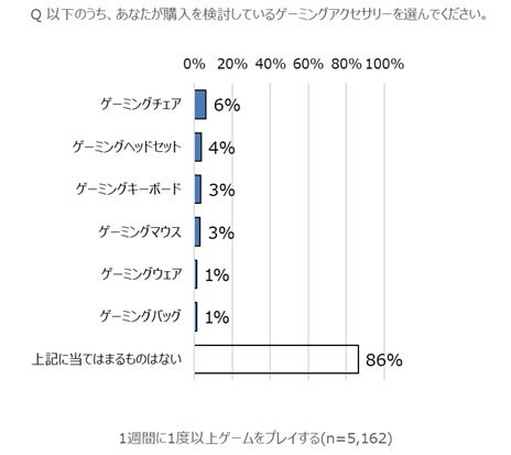 - 購入を検討しているゲーミングアクセサリー(周辺機器)は、「ゲーミングチェア」が6%、「ゲーミングヘッドセット(4%)」、「ゲーミングキーボード」と「ゲーミングマウス」がいずれも3%。