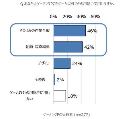 - ゲーミングPCをゲーム以外の「作業全般」にも利用している人は46%、つづいて「動画・写真編集」が42%に。ゲーミングPCがゲーム以外にも使用されていることが明らかに。