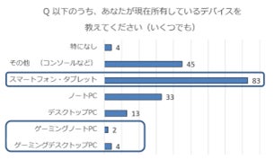 - 所有デバイスは「スマートフォン・タブレット」が最も高く83%。一方、ゲーミングPCの所有率は6%だが、興味があるデバイスとして「ゲーミングPC」が15%に上り、興味の高まりを感じさせる結果に。