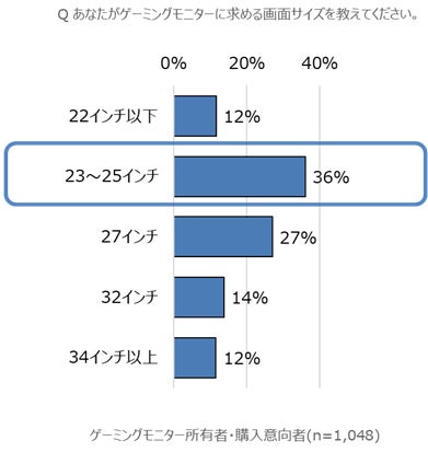 - ゲーミングモニターに求める画面サイズは、「23~25インチ」が最も高く36%、つづいて「27インチ」が27%。パネルの種類は、「IPS」が最も支持されており、次いで「QO OLED」となった。