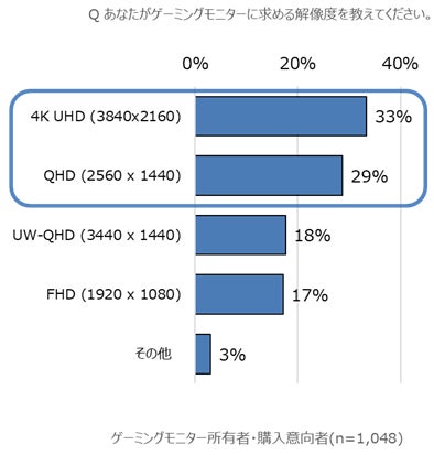 - ゲーミングモニターに求める解像度は、「4K UHD」が最も高く33%。ゲーミングモニターに求めるリフレッシュレートは「240Hz以上」が最も高く26%。