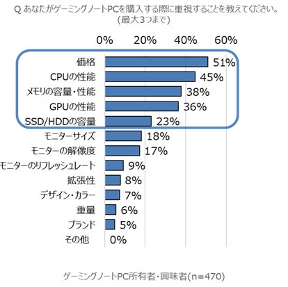 - ゲーミングデスクトップPCおよびゲーミングノートPCを購入する際に重視することは、ゲーミングデスクトップPCでは、「CPUの性能(52%)」が最も高く、ゲーミングノートPCでは、「価格(51%)」が「CPUの性能(45%)」を押さえて1位に。ゲーミングデスクトップPCとゲーミングノートブックPCで、ユーザーが求めるものが異なることが浮き彫りに。
