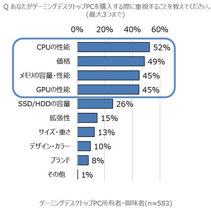 ゲーミングPCを購入する際に重視することを尋ねたところ、ゲーミングデスクトップPCでは、「CPUの性能」が最も高く52%、つづいて「価格(49%)」、「メモリの容量・性能(45%)、「GPUの性能(45%)」となった。一方、ゲーミングノートPCでは、「価格(51%)」が「CPUの性能(45%)」を押さえて1位に。つづいて「メモリの容量・性能(38%)」「GPUの性能(36%)」という結果に。