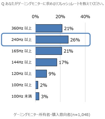 ゲーミングモニターに求める解像度は、「4K UHD」が最も高く33%で、次いで「QHD」が29%。ゲーミングモニターに求めるリフレッシュレートは「240Hz以上」が最も高く26%。つづいて「360 Hz以上」と「165 Hz以上」がいずれも21%という結果になりました。