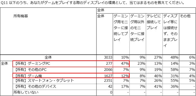 - 使用機器/プレイ環境に関する設問では、ゲーミングPCを主に使用するユーザーのうち、ゲーミング用モニターを使用している割合はもっとも高く47%。また、ゲーム機を主に使用するユーザーのうち、ゲーミング用モニターを使用している割合もゲーミングPCに次いで高く、12%だった。