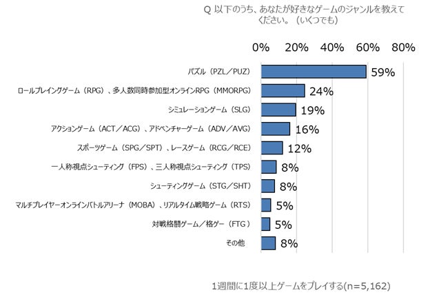 ● 好きなゲームジャンルは、「パズル」が最も人気で59%。