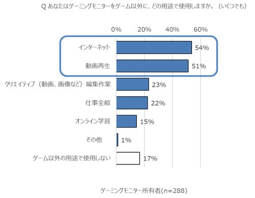 - ゲーミングモニター所有者はゲーム以外にも、インターネットや動画再生など多用途でゲーミングモニターを使用。ゲーム以外の用途では使用しないと答えた人はわずか17%。