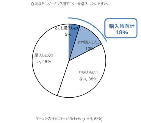 - 現在ゲーミングモニターを所有していない人に、今後の購入意向を尋ねたところ、「とても購入したい」「やや購入したい」と回答した人は合わせて18%。