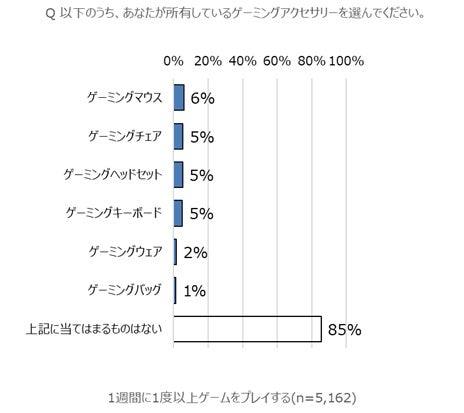 - 所有しているゲーミングアクセサリー(周辺機器)は、「ゲーミングマウス」が6%、「ゲーミングチェア」、「ゲーミングヘッドセット」、「ゲーミングキーボード」がいずれも5%。