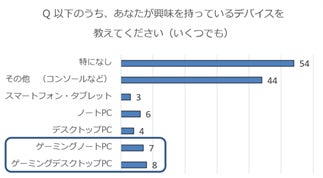 「スマートフォン・タブレット」の所有率は83%と最も高い結果となった。ゲーミングPCの所有者は、デスクトップとノートPCを合わせて6%だったが、興味を持っているデバイスを尋ねる質問では、「ゲーミングデスクトップPC」は8%、「ゲーミングノートPC」は7%で3位と4位になり、合わせて15%の人がゲーミングPCに興味を持っていることが分かりました。