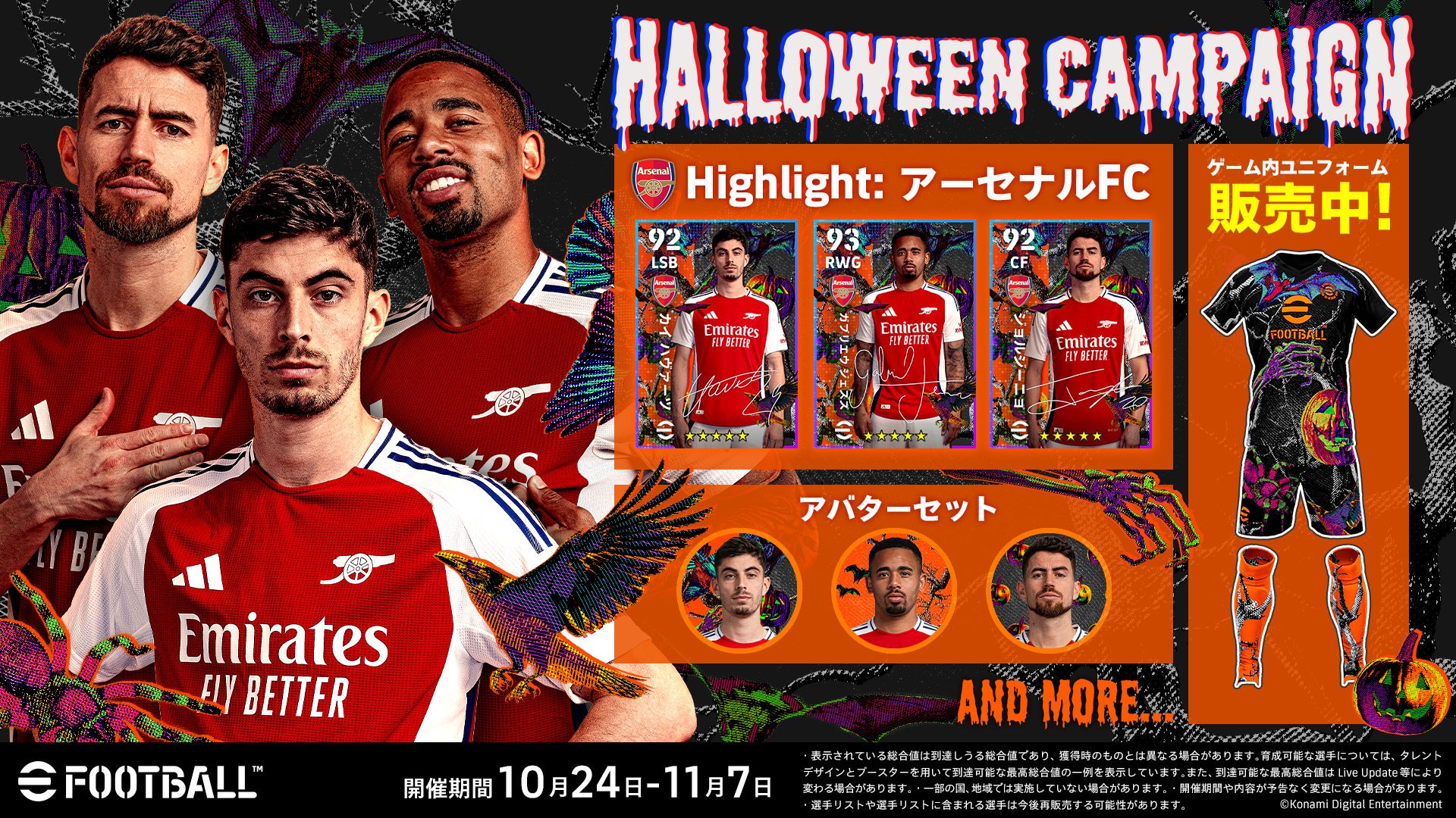 さらに、本日から開催している「Halloween キャンペーン」では、特別デザインのアーセナル FC カイ ハヴァーツ選手、ジョルジーニョ選手、ガブリエウ ジェズス選手が、自身がやってみたいというポジションで登場! スペシャルログインプレゼントとスペシャルログインボーナスで獲得できます。