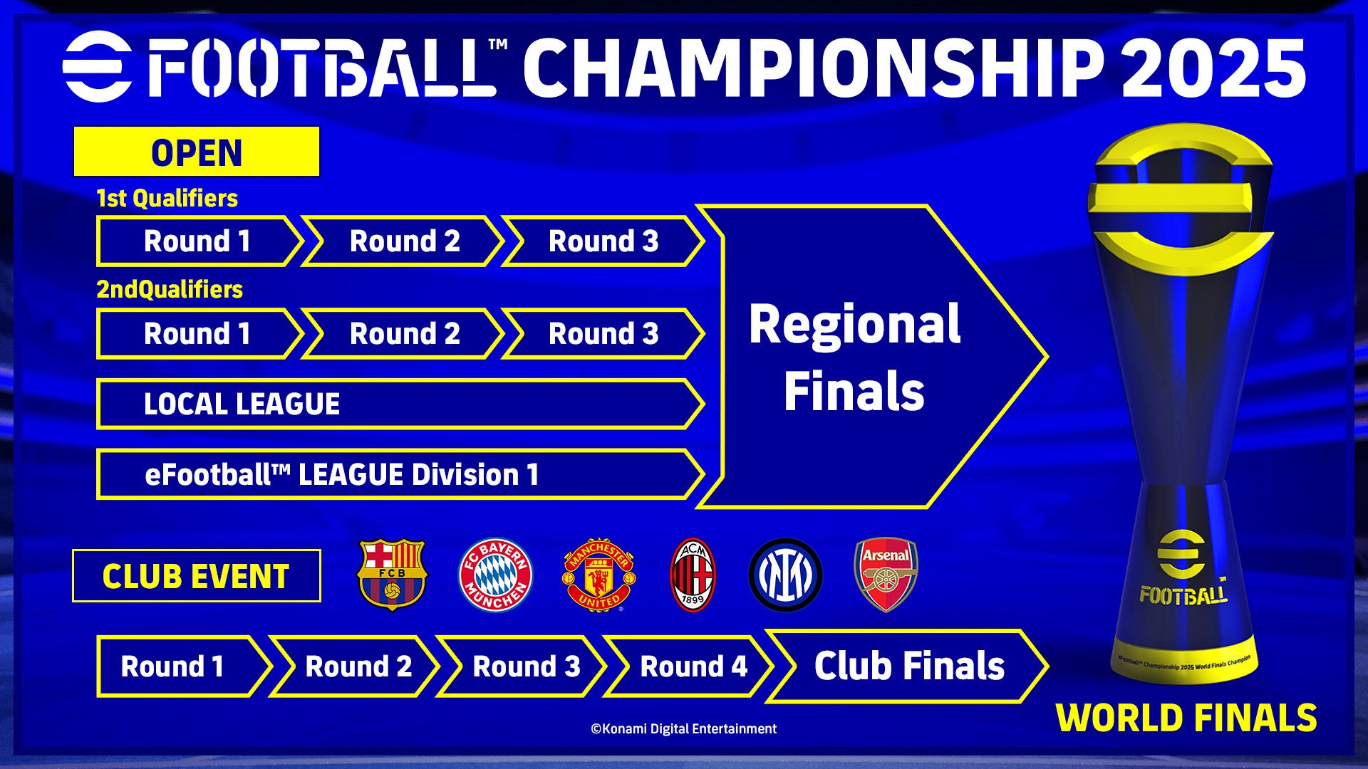 本大会は2024シーズンと同様に、全プレーヤーが参加可能な「eFootball™ Championship 2025 Open」(以下、Open)と、 『eFootball™』オフィシャルパートナークラブのファンNo.1を決める大会「eFootball™ Championship 2025 Club Event」(以下、 Club Event)の二つの大会で構成。両大会を勝ち上がったトッププレーヤーが、2025年夏に開催予定の「eFootball™ Championship 2025 World Finals」(以下、World Finals)で世界一の座をかけて激突します。