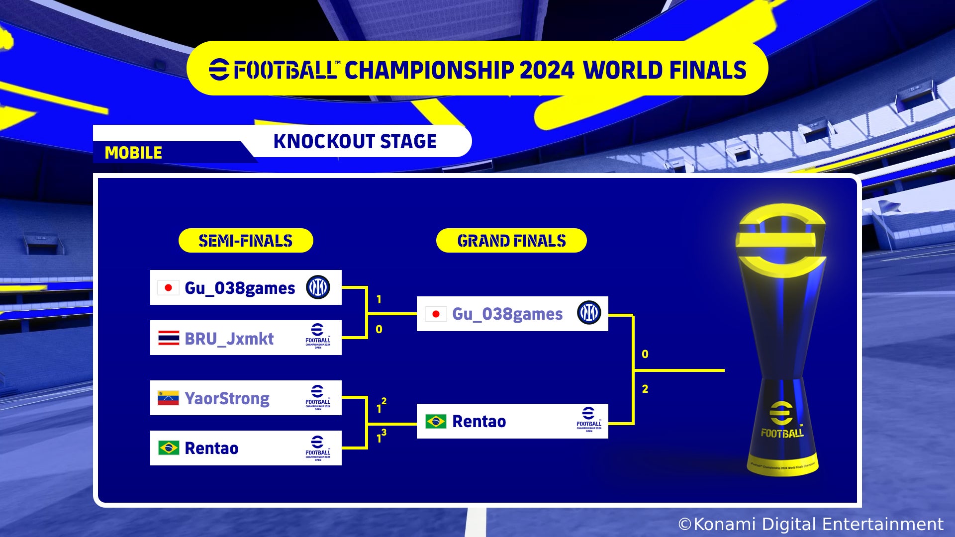 株式会社コナミデジタルエンタテインメントは、基本プレー無料の家庭用・PC・モバイルゲーム『eFootball™ 2024』を競技タイトルとしたeスポーツ世界大会「eFootball™ Championship 2024 World Finals」(以下、「World Finals」)を7月20日(土)と21日(日)にesports 銀座 studio(東京・銀座)にて開催し、モバイル部門で Rentao選手(ブラジル)が、コンソール部門(PS5)で Mayageka選手(日本)がそれぞれ初優勝したことをお知らせします。