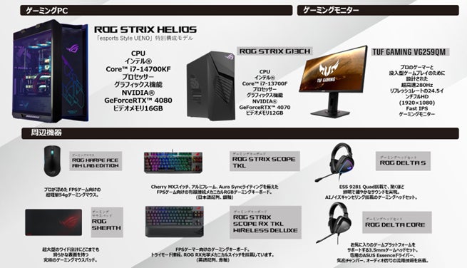 ASUS JAPAN株式会社が施設のプラチナスポンサーに就任したことで、ROG Harpe Ace Aim Lab Edition(マウス)/ ROG Hone Ace Aim Lab Edition(マウスパッド)/ ROG Delta S(ヘッドセット)などのROGゲーミングデバイスも含め、ゲーミングPC・モニター・周辺機器をすべてASUSブランドで統一したゲーミングPC環境を提供します。