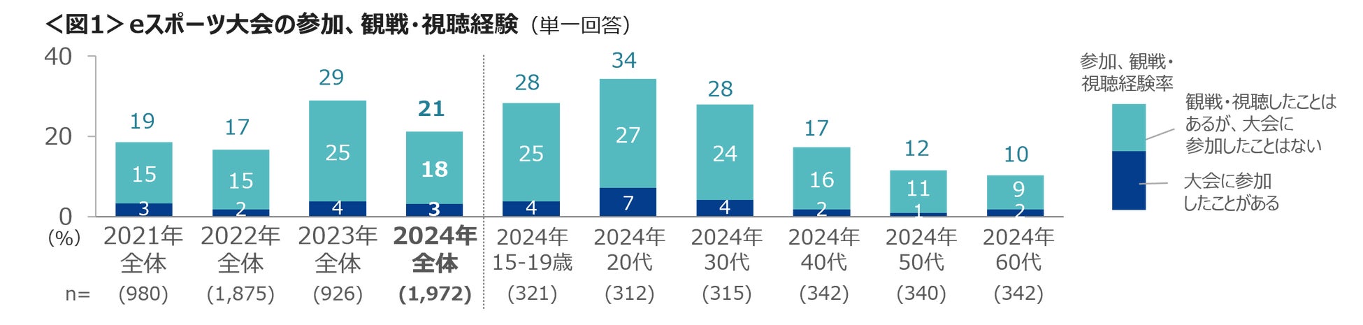 eスポーツの 「大会に参加したことがある」は3%、「観戦・視聴のみ経験がある」は18%、合わせて21%は参加、観戦・視聴経験がある。特に20代を中心とした15歳~39歳までの若い世代の参加、観戦・視聴経験率は3割前後であった。<図1>