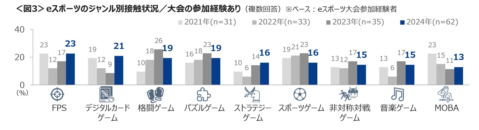 大会の参加経験は、「FPS」「デジタルカードゲーム」「格闘ゲーム」「パズルゲーム」が上位にあがり、観戦・視聴経験が8番手であった「デジタルカードゲーム」は参加経験では2番手に浮上。「FPS」や「デジタルカードゲーム」の参加経験は、この4年間の最高値であった。<図3>