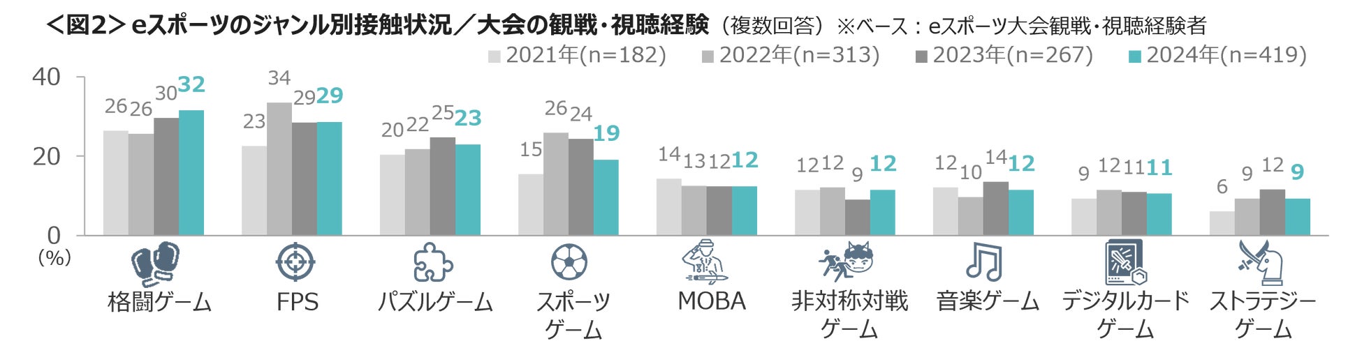 eスポーツの大会の観戦・視聴経験が高いジャンルは、「格闘ゲーム」「FPS」「パズルゲーム」がTOP3。初心者でも楽しめるようになったストリートファイター6の影響からか「格闘ゲーム」は高まっている。<図2>