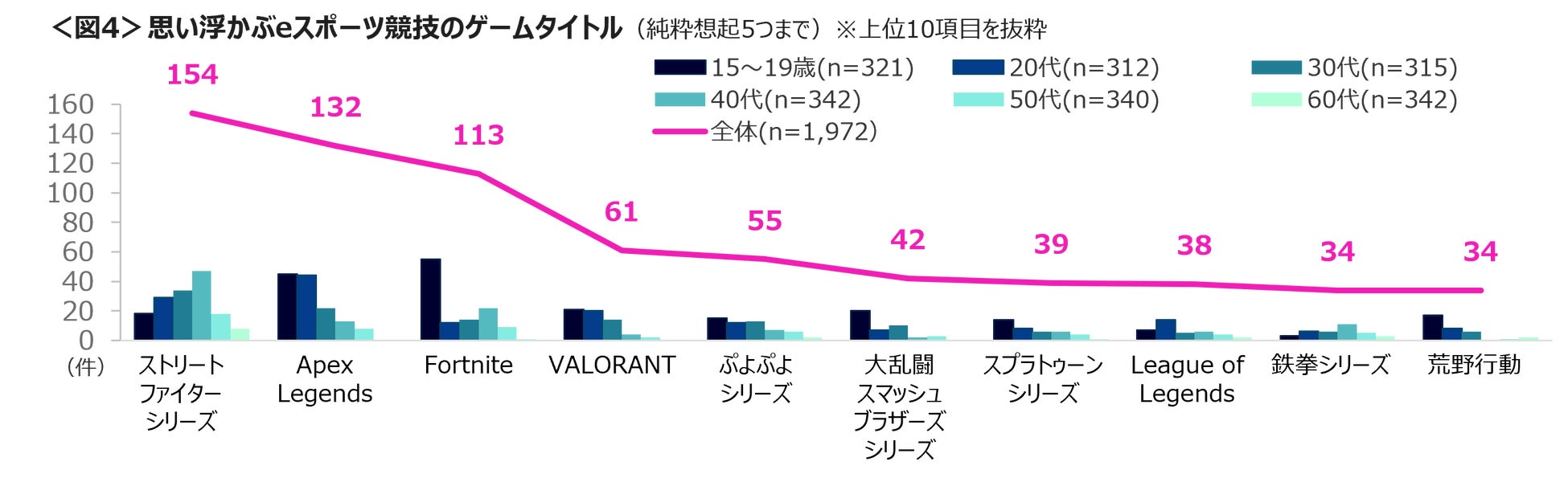 ゲームタイトルを呈示せずに、eスポーツ競技で行われているゲームタイトルを聴取した。「ストリートファイターシリーズ」154人、「Apex Legends」132人、「Fortnite」113人が思い浮かぶeスポーツゲームとしてあげている。年代別には、40代「ストリートファイターズシリーズ」、15~19歳と20代は「Apex Legends」、15~19歳「Fortnite」の想起率が高い。<図4>