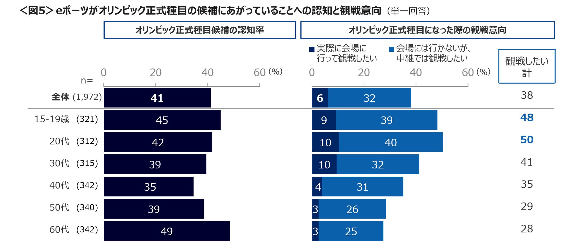 eスポーツがオリンピックの正式種目の候補にあがっていることへの認知は41%、60代は49%と多い。正式種目となった場合、「会場に行って観戦したい」は6%、「中継で観戦したい」は32%と合わせて38%は、観戦意向を示している。15~19歳、20代の観戦意向は半数と高い。<図5>