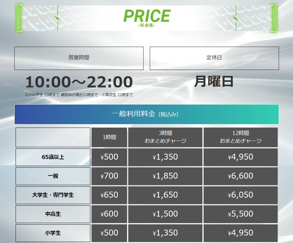 ■料金:一般1時間700円/小学生500円/中高生600円/大学生650円