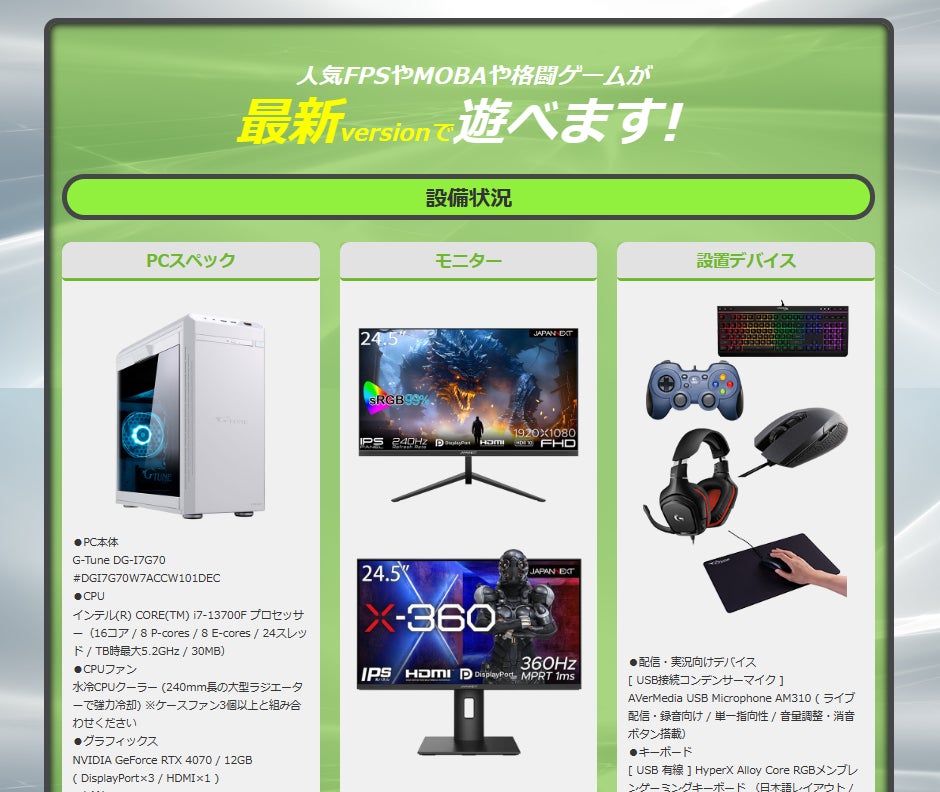 ■常設ゲーミングPC:33台(Corei7-13700F、GeForceRTX 4070搭載のG-Tune DG-I7G70)