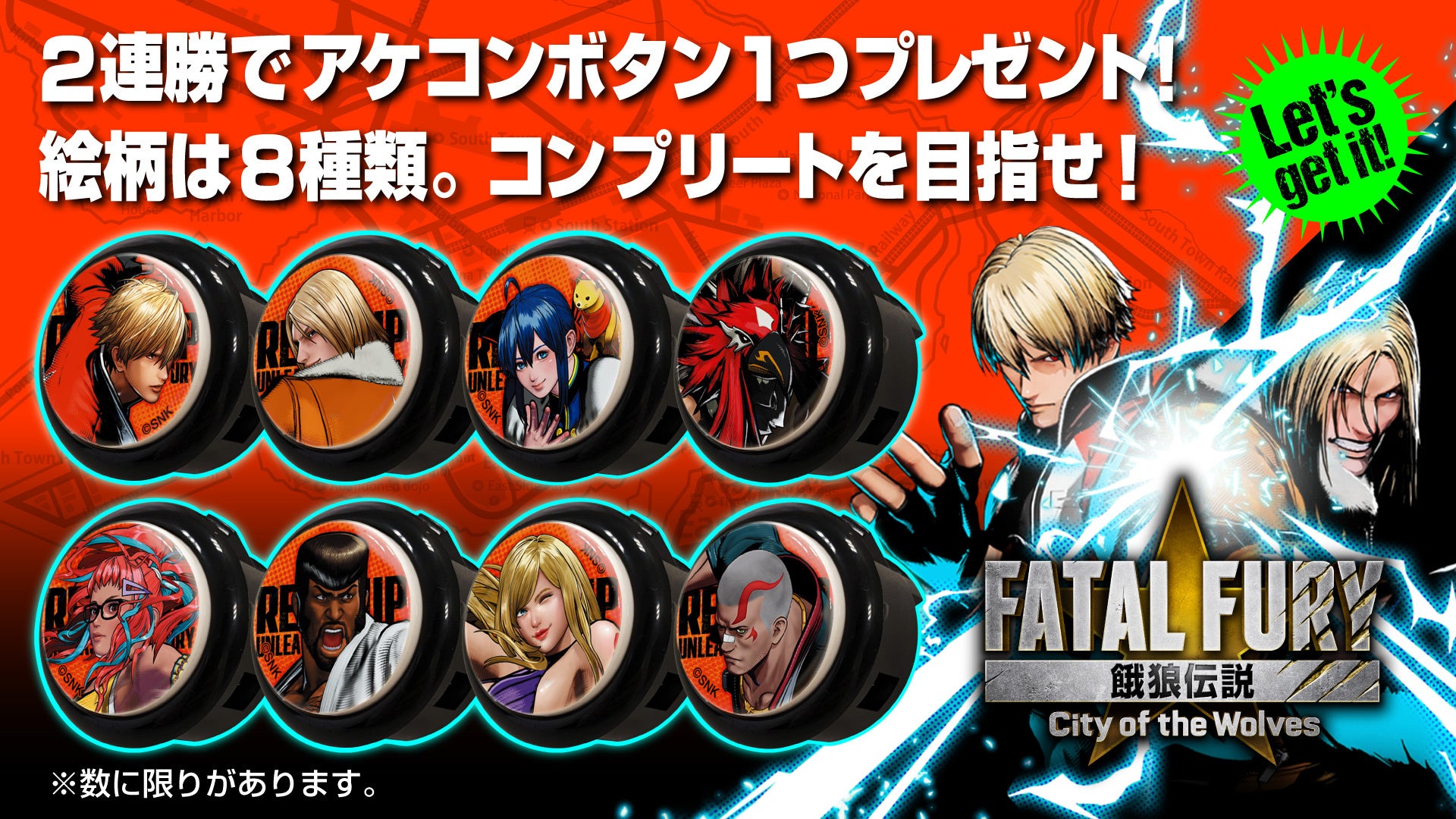 2本先取制の対戦台を用意。2人の対戦者に勝利すれば、『餓狼伝説CotW』アケコンボタンを1つプレゼント。絵柄は8種類。コンプリートを目指せ!