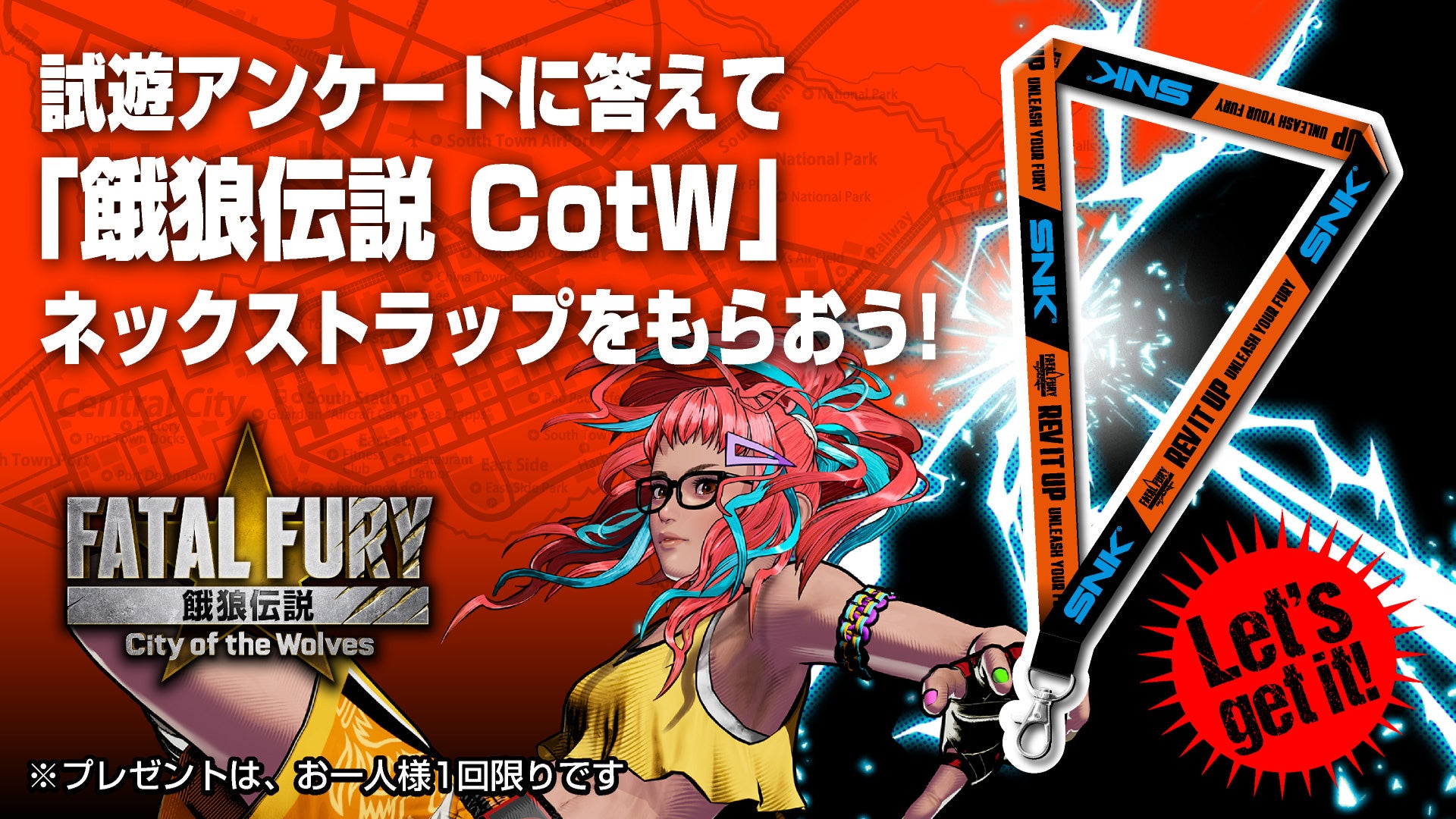 『餓狼伝説CotW』の試遊アンケートにお答えいただいた方に、オリジナルネックストラップをプレゼント。試遊後は、アンケートにご協力お願いします。